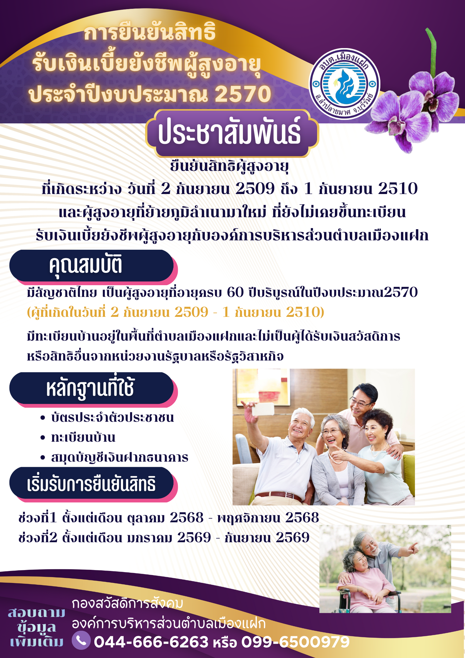 ประชาสัมพันธ์ การยืนยันสิทธิรับเงินเบี้ยยังชีพผู้สูงอายุ ประจำปีงบประมาณ 2570 |